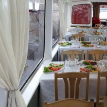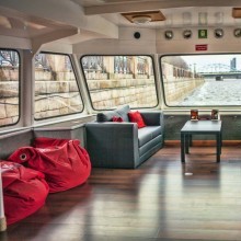 Savukārt apakšējā klājā ir izveidots moderns pasažieru salons ar panorāmas logiem, mīkstajiem dīvāniem un bāru/kafejnīcu.