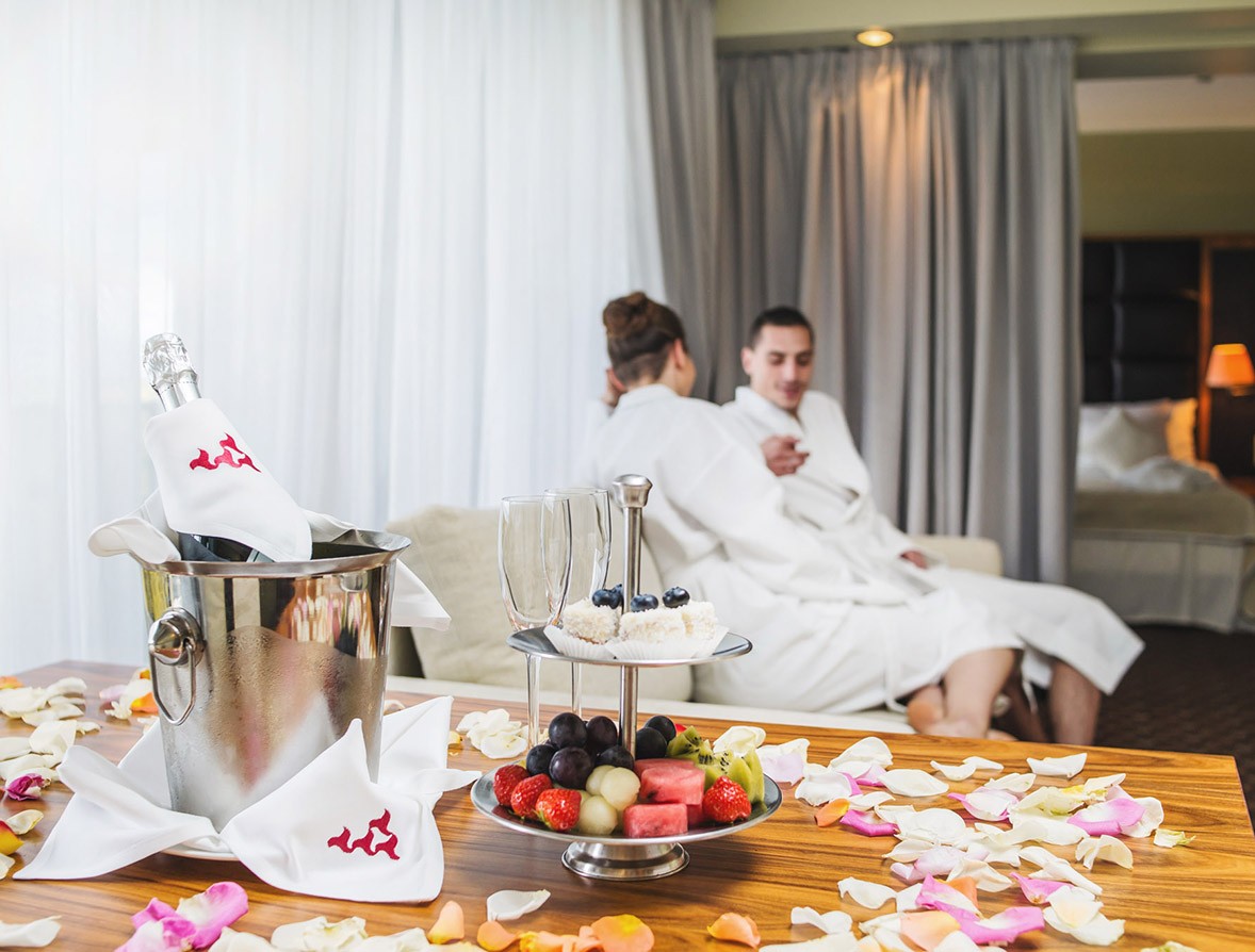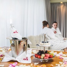 ° номер для молодоженов с романтичным оформлением, с поздним выездом до 16:00, посещением центра саун и бассейнов, а также завтраком в номере,